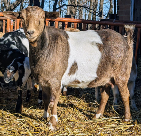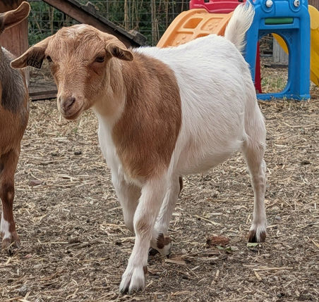 Eshe comes to us from Stump Hill Farms! We are super excited to add this girl to our program! She is our only purchased doe kid for the 2025 season. She is super flashy but also built like a tank! She will be part of the future of our program as we work towards our goal of well built colorful goats.